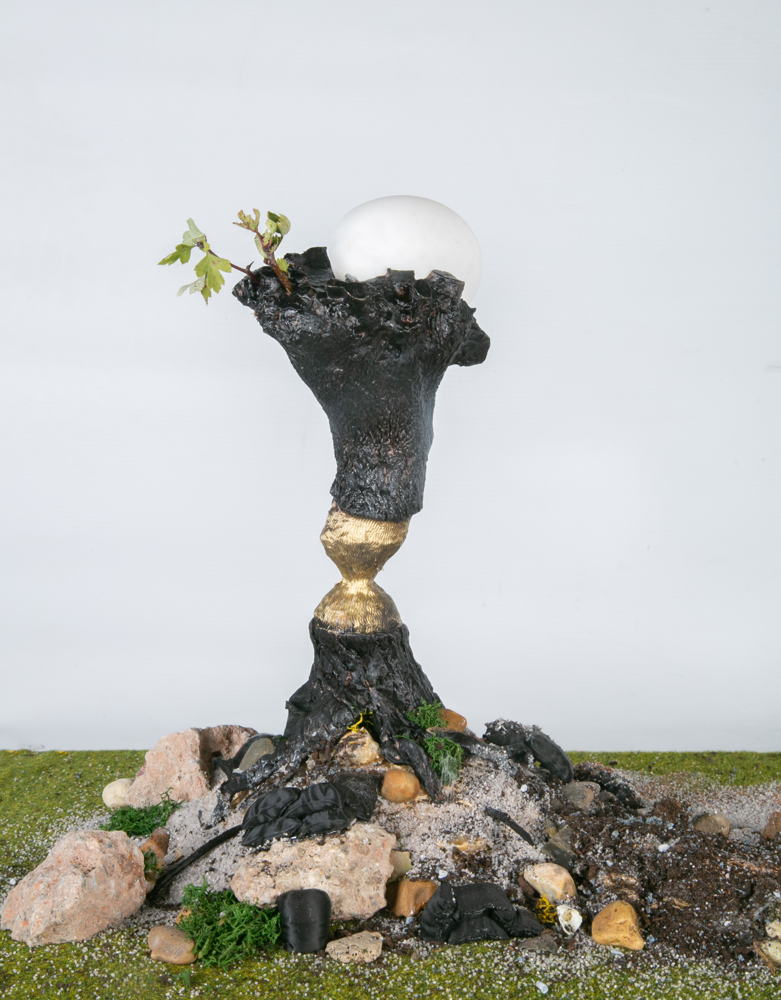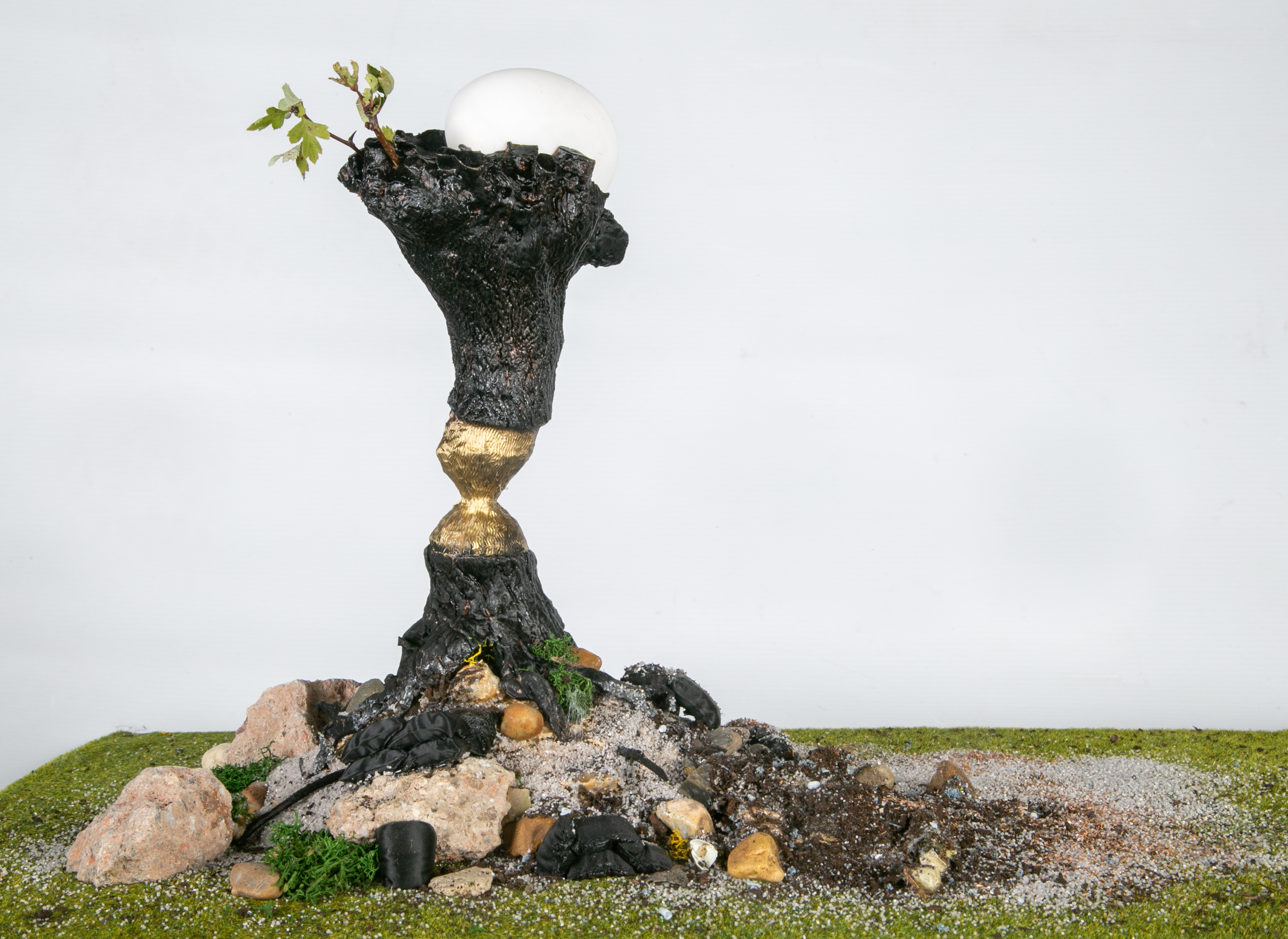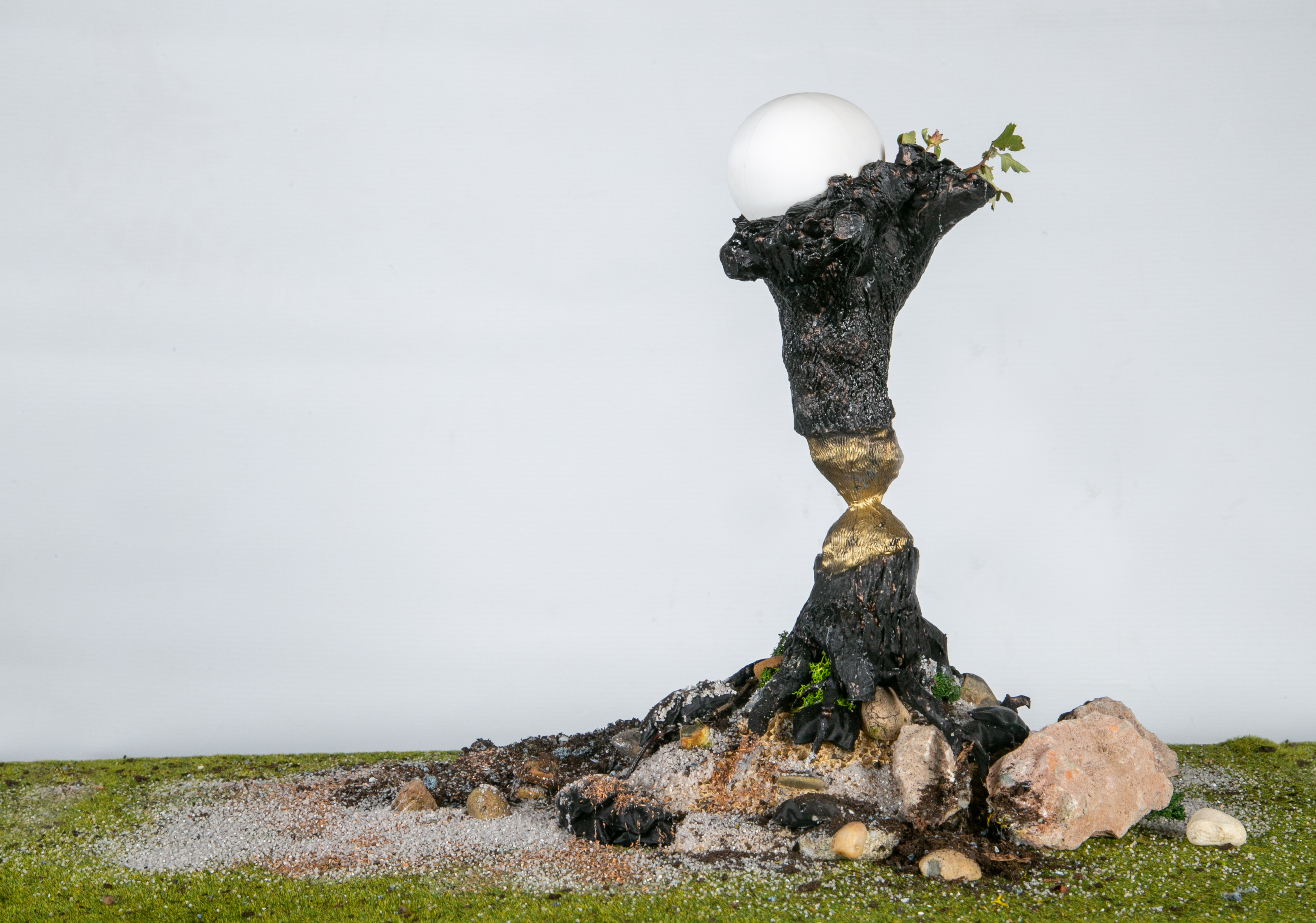 The trunk bears the marks of the beaver – the engineer of the Meuse – gnawing, building, and struggling to find space in a landscape regulated by humans. Man and beaver mirror each other: both trying to tame the water, set boundaries and shape their habitats. The tree is crowned by an egg, symbolising hope and new beginnings. In this way, human, animal and river intertwine into one shared story.