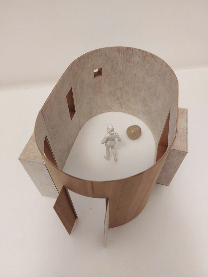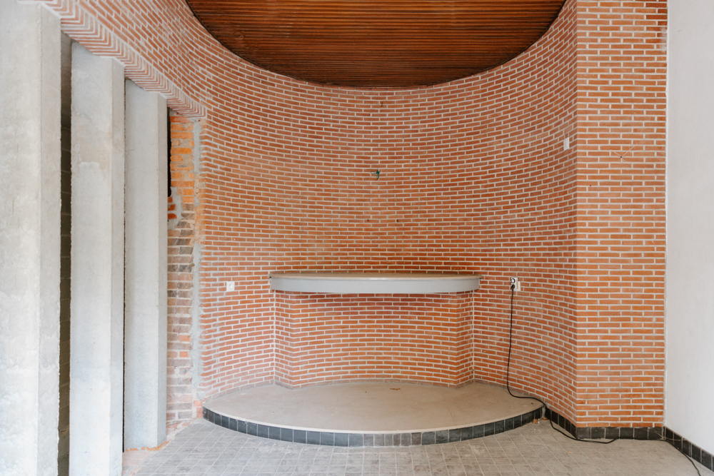 De kapel bleek voor het architectenduo en Andrews een vruchtbare plek. De ronde vorm van het gebouw werd het uitgangspunt voor het ontwerp. Pauline Clarot & Leander Venlet: “Daar waar het werk van Amber bol staat van kleur en actie, is onze architecturale ingreep subtiel. In de ruimte brengen we een houten constructie in de vorm van een pil, waar vijf nissen voorzien zijn voor o.m. het Mariabeeld en zitplaatsen voor bezoekers. Zo kan je de muurschildering van links naar rechts en van rechts naar links lezen, zonder begin- of eindpunt. We zien onze ingreep niet als architectuur op zich, maar als een canvas voor de muurschildering en voor de ervaringen van de bezoeker. Her en der zijn er ook knipogen naar Z33 verwerkt in de kapel. Een raampje laat toe om vanuit de kapel naar de trappenhal van Z33 te kijken, zo komt het ‘instituut’ in de kapel en vice versa. De betonvloer is ook een voorbeeld van zo’n stille verwijzing.” Voor Z33 versterkt het ontwerp de belevingswaarde van de kapel, zonder aan de functies te raken. Bezoekers kunnen er tot rust komen of bidden. Bovendien wordt het oorspronkelijke 16de-eeuwse Mariabeeld gereinigd en teruggeplaatst.